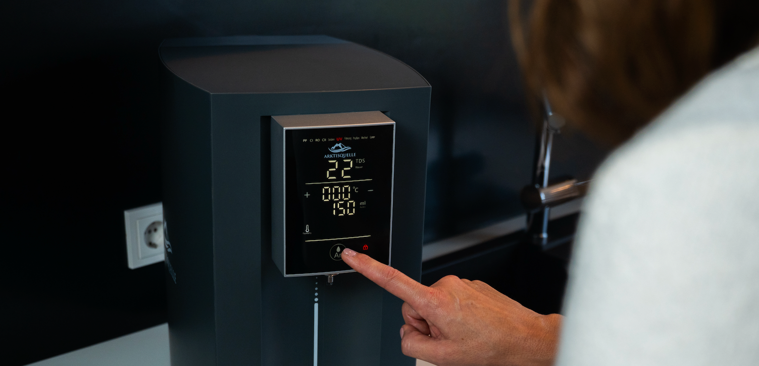 Die Arktisquelle® bietet dir die Möglichkeit, deine Wasserqualität immer im Überblick zu haben. Durch eine TDS Messanzeige auf dem Bildschirm hast du einen zuverlässigen Indikator für deine Wasserqualität. Der TDS-Wert gibt die Summe der im Wasser gelösten Feststoffe an.
